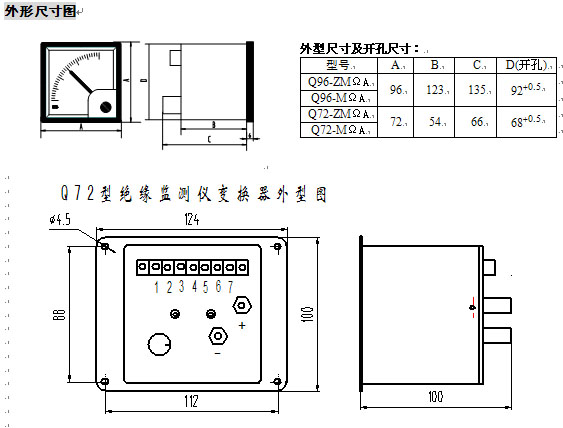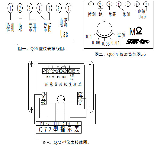 概述 | 主要參數和技術指標 ● 儀表指示偏轉角:Q96-MΩA、Q72-MΩA,90°Q96-ZMΩA、Q72-ZMΩA, 240° ● 使用環境溫度范圍:-25℃~+55℃ ● 耐振動:頻率1~100Hz,加速度≤10m/s2 ● 絕緣強度:線路對外殼2000Vac,1min ● 外磁場強度:≤400A/m ● 儀表準確度等級:⑩級(基準值為指示值,按GB/T7676-1998中相關要求) ● 工作電源容差:100Vac(或220Vac)±15% ● 儀表消耗功率:不大于5VA ● 輸出觸點容量:阻性,28V,5A;220V,1A ● 報警設置及容差:10kΩ±2kΩ;30kΩ±3kΩ 60kΩ±3kΩ;100kΩ±5kΩ ● 儀表重量:Q96-ZMΩA、Q72-ZMΩA, 1.1kg Q96-MΩA、Q72-MΩA, 0.9kg |